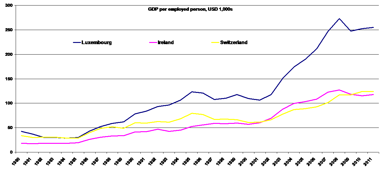 Suppose a bet €1.00 was made on Ireland Inc based on its external economic performance back in 1995. An investor betting on our external balance would have grossed 0.393 cents on every euro invested by today and can be expected to gross a loss of 1 cent by 2015. An identical bet on Luxembourg would have netted a gross return of 11.23 cents by now, and a projected gain of 13.305 cents by 2015. The differences are slightly less dramatic when we look at comparison to Switzerland: a bet of €1.00 on Swiss external balance made in 1995 would have netted investor 9.54 cents by 2010 and is expected to yield 11.88 cents by 2015. Oh, and there wouldn't be any risk of getting these returns expropriated by the Government tax policy changes.