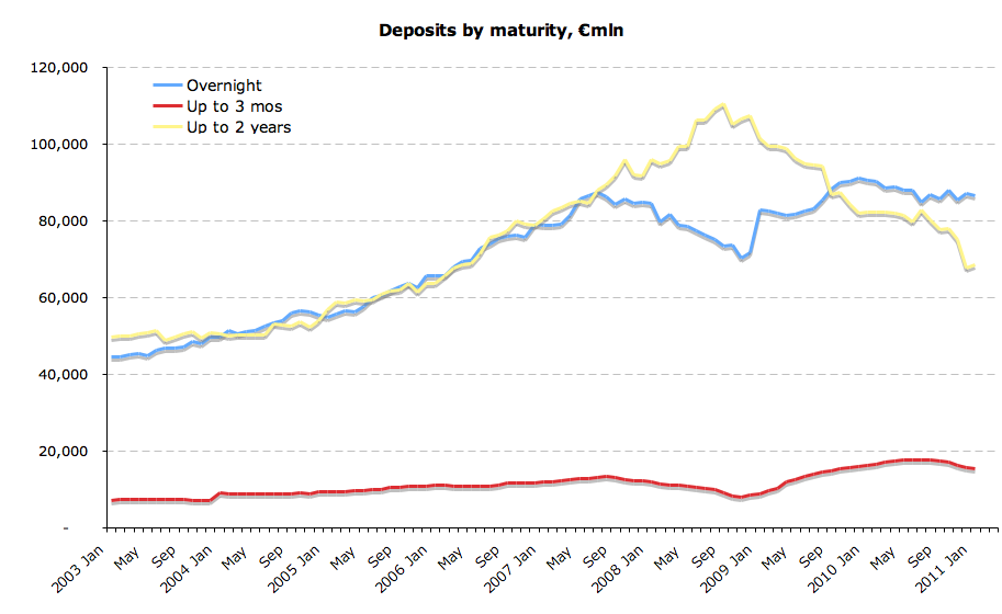 - Europe "must stop attempting to combat the crisis in Greece and Ireland by forcing these countries to pile more debt onto their existing debts by saddling them with overpriced loans." Note that the Der Spiegel journo actually fails to understand what Eichengreen is saying here, for the journalist then launches into a next question: "But at the same time, Europe is stifling any chance of growth in Greece and Ireland by forcing them to comply with harsh austerity measures. Is there any way this strategy can actually add up?" Like the rest of Europe, he does not comprehend the reality of what we are facing. It's not the austerity that is going to kill us, it's the DEBT!