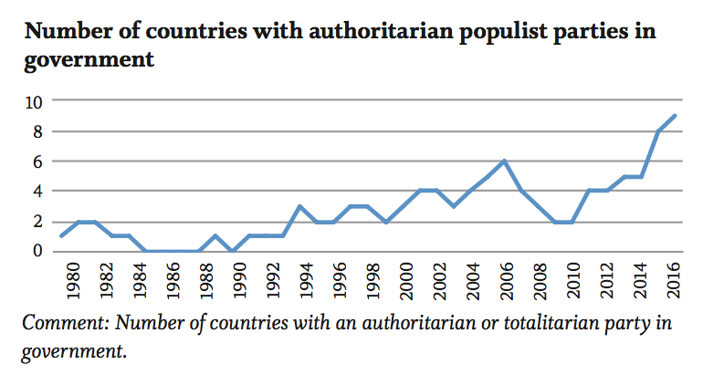Save for the correction downward in 2007-2009 period, authoritarian parties have been on an increasing power trend since roughly 1990, with renewed upward momentum from 1999.