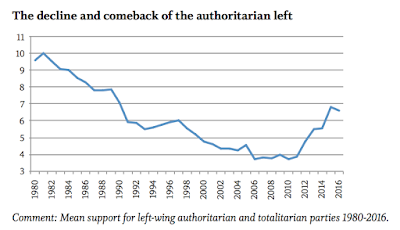 And the direction of this trend toward greater populism in European politics is quite astonishing. Per Timbro, “discussions on populism too often focus only on rightwing populism. Practically everything written on populism, at least outside Southern Europe, is almost entirely concerned with right-wing populism. Within the political sciences the study of right-wing populist parties has even become its own field of study, while studies on leftwing populism are rare.”