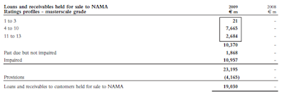 And have a laugh - page 15: ROI Nama-bound loans provision is 16.6%, UK Nama-bound loans are 5.1% and overall impairment charge due to Nama (remember, this accounts for risk-weighting changes) of 14.54% (Table at the bottom of page 15).