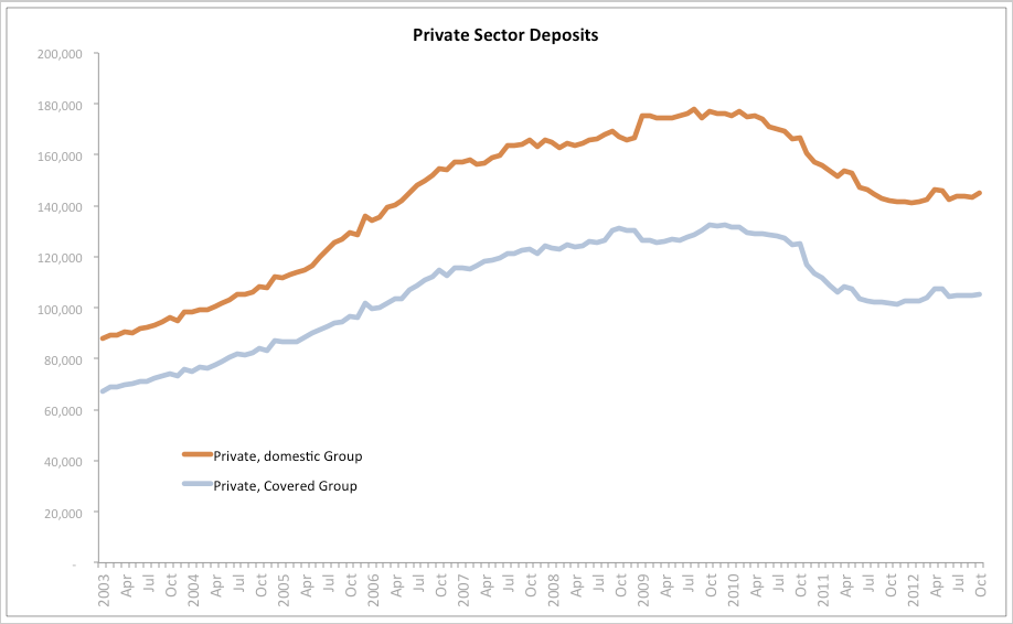 - Nonetheless, Irish Residents' Private Sector deposits with Covered Banks in October 2012 were still down 15.8% on same period of 2010 and down 20.7% on same period 2009.