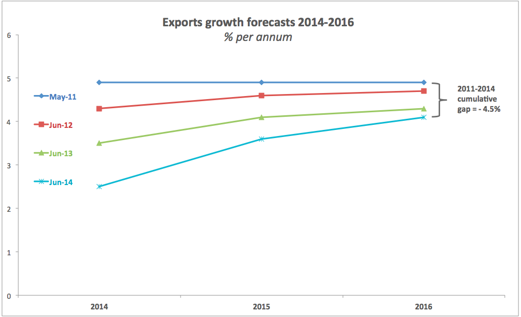 Again, things are going South: in June 2013 the forecast for 2014 growth rate in exports was 3.5%. In June 2014 it is down to 2.5%. Back in June 2011, IMF predicted that over 2014-2016 Irish exports will rise 15.4%, this June the prediction is 10.5%.