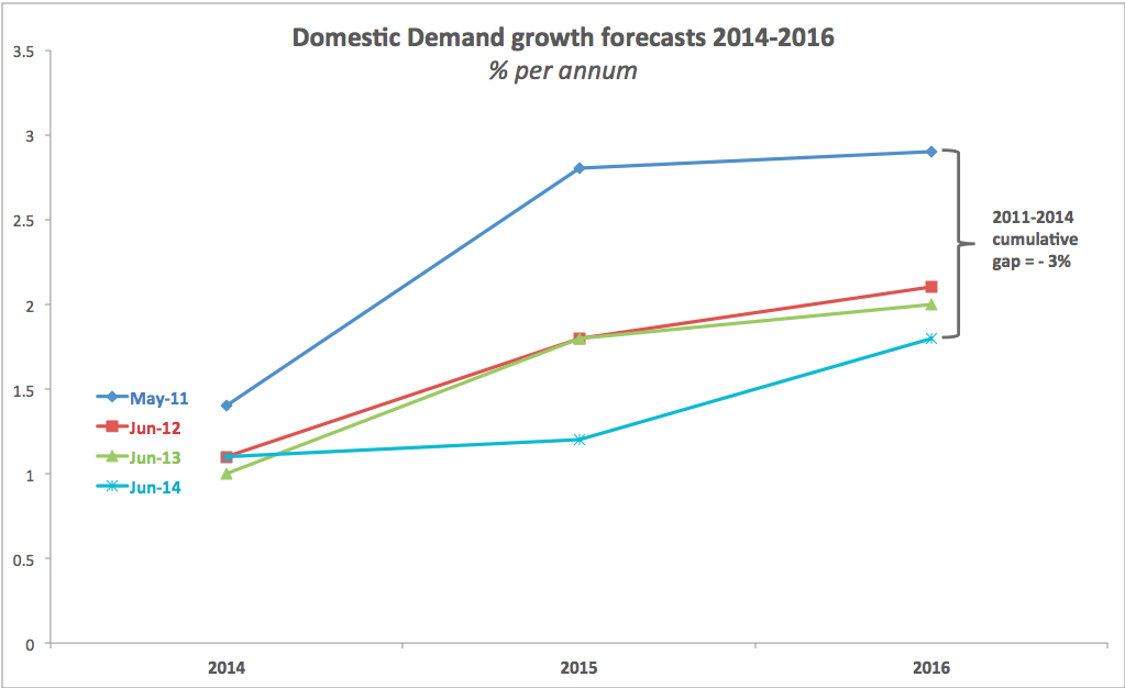 The upgraded forecast for 2014 compared to the Fund predictions published a year ago is a welcome sign. But at 1.1% y/y growth this is hardly consistent with anything more than a stagnation. However, after 2014, the Fund is still projecting ver-lower rates of growth compared to its previous forecasts. In June 2011, the Fund projected 2014-2016 cumulative growth in Domestic Demand to be 7.3%. In June 2013 that same projection was 4.9% and this time around it shrunk to 4.2%.