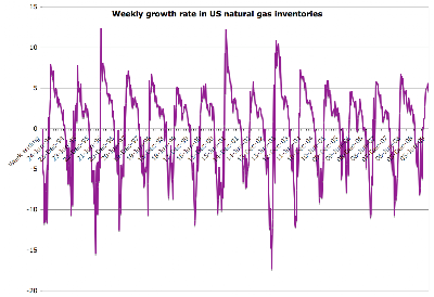 Yet another interesting feature of the data is captured in Chart 3, which clearly shows that in recent months, weekly growth rate in inventories has not fallen substantially for positive growth rates, while the rate of natural gas inventories depletion (the negative range) has declined.
