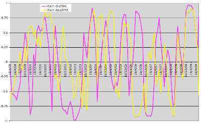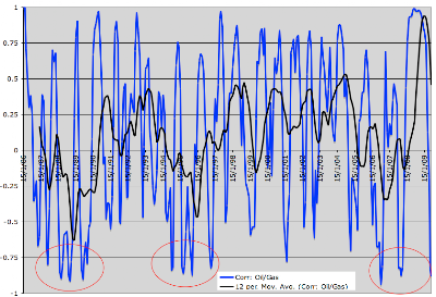 Chart above shows the replay of the oil and gas prices correlation in line with the broad equity markets. Here, while correlation between DJIA and oil prices stands at +0.78 and remains in the positive territory since September 2008, the correlation between DJIA and gas prices is at -0.57 and has moved into negative territory in May 2009.