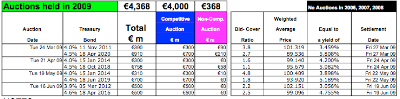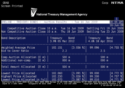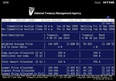"Total bids were received for €2.397 billion and it was decided to issue a total of €1 billion [as planned]. An amount of €500 million of the 4.6% Treasury Bond 2016 was issued where the total bids received were 2.5 times the amount allocated, while €500 million of the 3.9% Treasury Bond 2012 was also issued where the total bids received were 2.2 times the amount allocated. The 2016 bond was sold at an average yield of 4.755% while the 2012 bond was sold at an average yield of 3.056%."