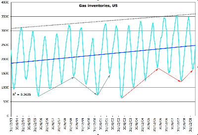 One noticeable feature here is that volatility below the trend has been declining throughout the April 2003-April 2006. Afterward, the maximal depletions of gas reserves have steadily increased through April 2008, before once again starting to decline in late 2008 through April 2009. The rate of the later decline has been so far consistent with the rate of decline in 2003-2006 period. This is exactly identical to the 4 years falling, 3 years rising and 1 year falling cycle in 1996-2002.