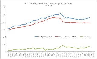 - Historical comparatives for total disposable income are also looking good. Average income since Q1 2008 was EUR22,984mln, so we are close to that in the latest figures. We are also ahead 2010 average (EUR22,198mln), 2011 average (EUR21,693mln), but below 2008 average (EUR25,061mln) and 2009 average (EUR23,310mln).