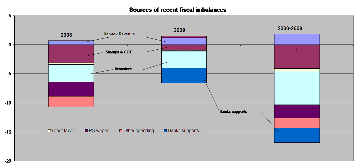 [The Fund is generally positive on the measures taken so far. However, in the chart at the bottom of page 22, the report shows the overall contribution to fiscal imbalances across various categories of spending and receipts. Picture 1 reproduces, with added details, the IMF analysis. Several things that are not covered by the Fund analysis stand out as significant omissions, most likely politically motivated. First, there is a very substantial role played by the continued deterioration in transfers (social welfare, health etc) which the Fund glances over. Second, public sector wages bill continues to represent further downward pressures on fiscal deficit despite the measures taken in 2009.