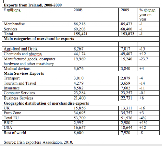 Credit and banking crisis had a direct impact on our trade. In the first half of 2009, Irish exports of services have experienced a severe contraction due to the collapse in international financial services activities. Only a strong performance by the business services and above-average performance by computer services have allowed for some recovery from this shock, with the value of overall services exported from Ireland falling just 1% to €68.4 billion over the course of full year.