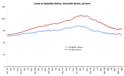 Smoothing out some of the monthly volatility, average ratio of private sector loans to deposits in the repaired Irish banking system rose from 145.8% in April-June 2012 to 147.0% in three months through January 2013.
