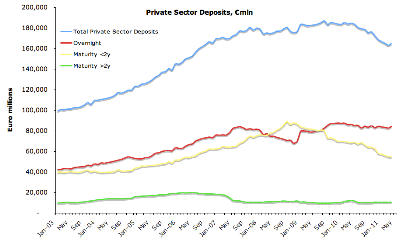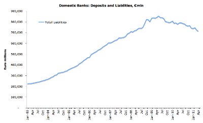 Deposits held in Irish ‘covered’ banks have fallen 13.9% between June 2012 and January 2013. In three months through January 2013 average levels of Irish residents' private sector deposits was down 2.34% on three months through June 2012, clocking annualised rate of decline of 4%. Over the same period of time, loans to Irish private sector fell 1.54% (annualised drop of 2.7%).