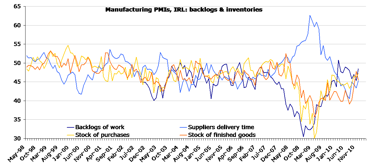 Again, quoting NCB: "After increasing in August, suppliers’ delivery times shortened marginally in September, although the majority of respondents noted no change in vendor performance. The rate of decline in purchasing activity quickened markedly over the month, and was the