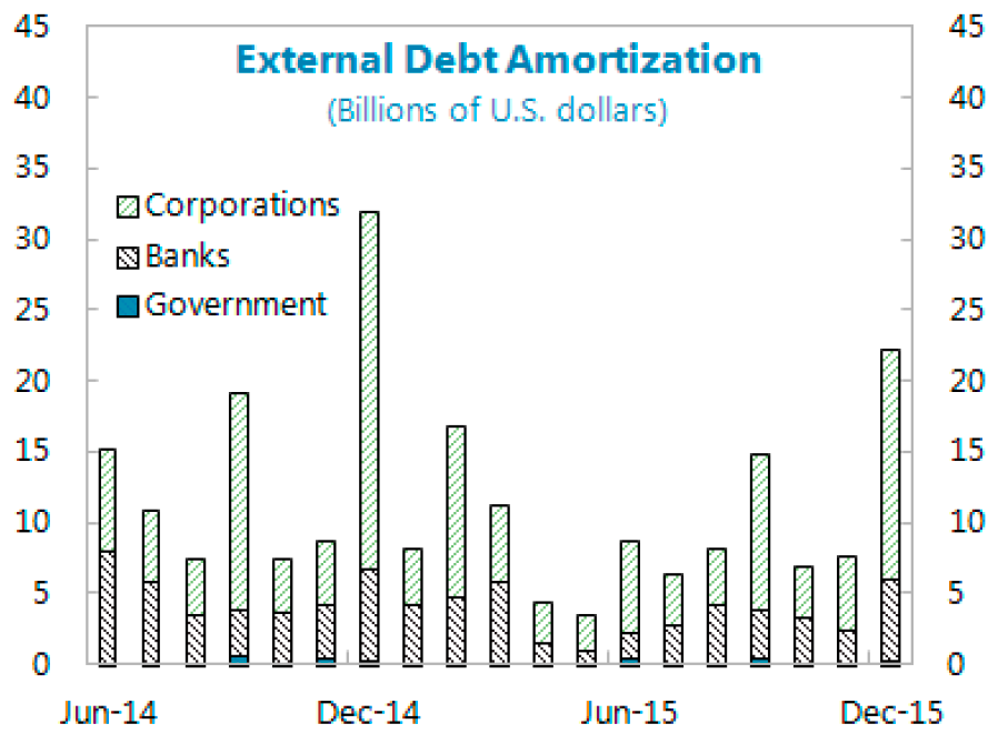 The balance of debt maturing in May-December 2015 involves banks liabilities. All are loans and deposits (except for demand deposits) including debt liabilities to direct investors and to direct investment enterprises. Which means that around 25-33% of the total banks liabilities USD26.57 billion maturing is cross-referenced to group-related debts and investor-related liabilities. Again, should a crunch come, these can be rolled over internally. The balance of USD19.9 billion will have to be funded.