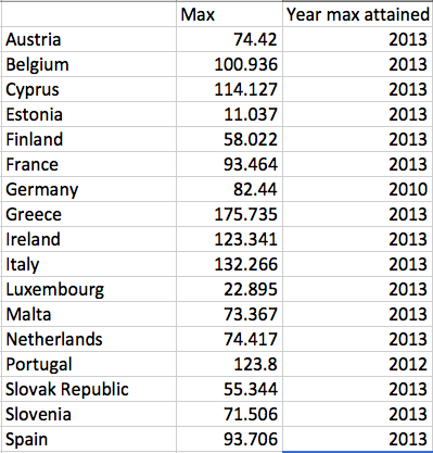 Table summarises 2007-2013 maximum debt levels (for General Government Debt as % of GDP) attained by the euro area economies and the year when this maximum was attained:
