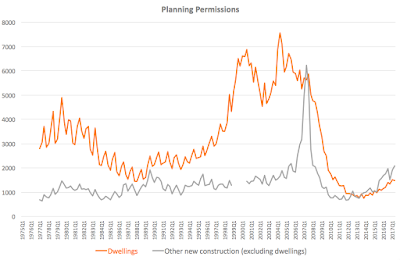 One thing that jumps out is the continued frenzy in building activity in Dublin, predominantly (exclusively) in the commercial space (offices). Not much finished. Lots being built. For now, Irish builders (mostly strange new players backed by vultures and private equity) are still in the stage where buildings shells are being erected. The cheap stage of construction. Very few are entering the fit-out stages - the costly, skills-intensive works stage. And according to several sector specialists I spoke to, not many fit-out crews are in the market, as skilled builders have not been returning to the island, yet, from their exiles to the U.S., Canada, Australia, UAE, and further afield.
