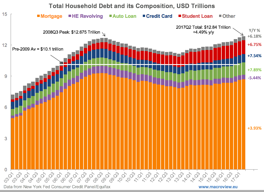 U.S. data for household debt for 2Q 2017 is out at last, and the likes of Reuters and there best of the official business media are shouting over each other about the ‘record debt levels’ warnings. As if the ‘record debt levels’ is something so refreshingly new, that no one noticed them in 1Q 2017.