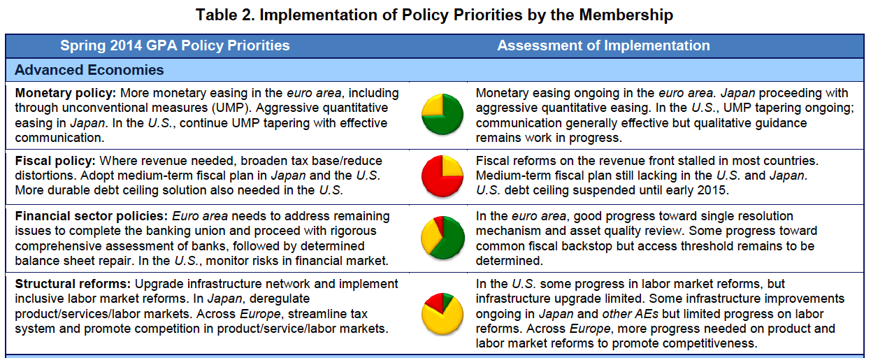 - "Lifting growth. Decisive structural reforms are needed to bolster confidence and lift today’s actual and tomorrow’s potential growth and break the pattern of persistent underperformance and insufficient job-creation. Accommodative monetary policies should continue to support demand and provide breathing space as these reforms are implemented. But it is essential that they are accompanied by macro-critical reforms that remove deep-seated distortions in labor and product markets; improve credit flows to productive sectors; strengthen growth-friendly fiscal frameworks; and eliminate infrastructure gaps." You get a sense that this has been said before, argued many times over and offers nothing new. In effect, the IMF is saying: spend more, cut spending more, re-spend more; and fund it all by printing presses, while making sure the rag-tag of the real economy (SMEs and households) don't get their hands on the printed cash.