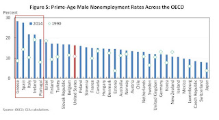 "The economy, however, can also be trapped in a low pressure steady state. In this steady state, job finding rates are low, unemployment is high, and many job-seekers are unskilled as long unemployment spells have eroded their human capital. Slack labor markets lower the outside options of workers and drive wages down, but hiring is still limited as firms find it costly to retrain these workers." Once again, I am not entirely convinced we are facing higher costs of retraining low skilled workers (as argued above), and I am not entirely convinced we are seeing the problem arising amongst the low skilled workers to begin with. Post-2008 recovery has been associated with more jobs creation in lower skilled categories of jobs, e.g. hospitality sector, restaurants, bars, other basic services. These are low skilled jobs which require minimal training. And, yet, we are seeing continued trend toward lower labour force participation rates. Something is missing in the argument that hysteresis is triggered by cost of retraining workers.