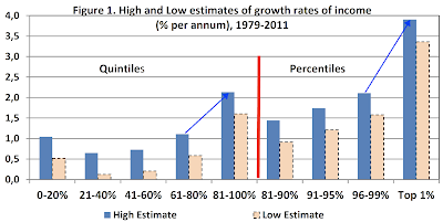 1) The dramatic growth differential between income estimates for all quintiles compared to the top quintile is fully accounted for by the massive growth in income of the top 5% of the populations and especially by the growth in income of the top 1%.